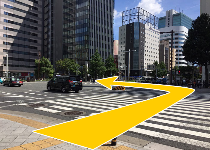 JR改札を出た後、名鉄百貨店方面(高島屋)桜通口を出て、道なりに右に曲がってください。スパイラルタワーを左手に見ながら、まっすぐ進むと、「笹島」の大きな交差点にぶつかります。