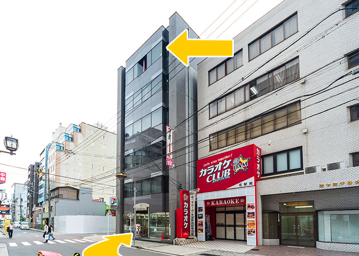 名鉄レジャックビルを正面に見て、左斜め前に1階がローソンの「ダイワロイネットホテル」があります。 その手前の道を左に入り、一つ目の交差点、1階がセブンイレブンの「第2アスタービル」6階です。 -