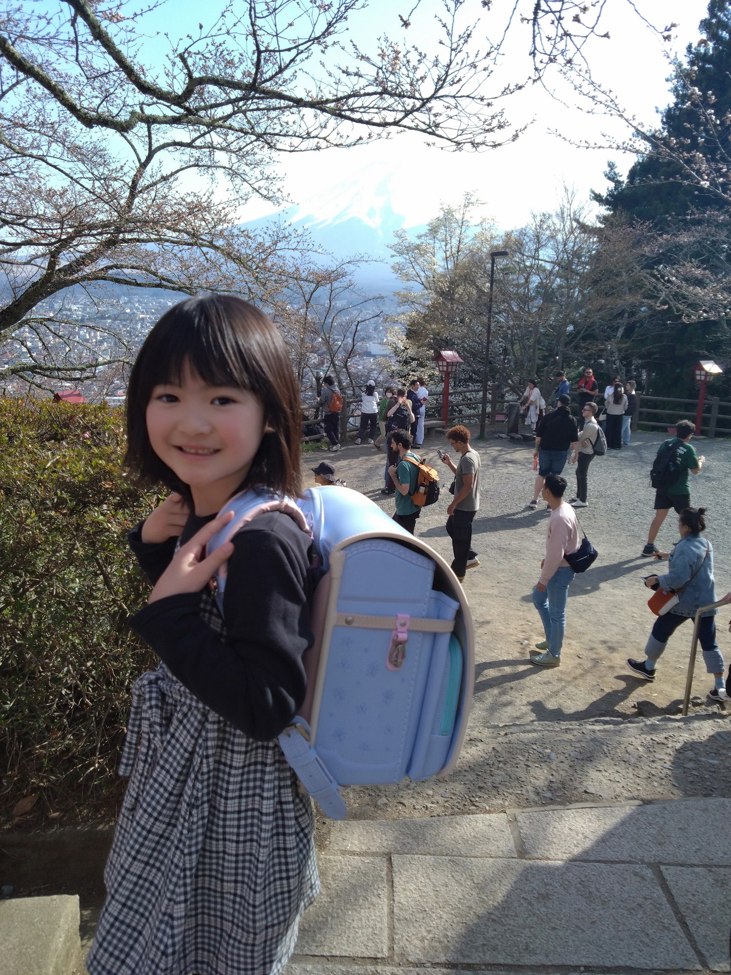 兄の購入時に、使いやすさから妹も絶対フィットちゃん!と決めておりました。ついに3年後、その時が来ました!2回のショールーム訪問で、どちらも店員さんが優しかったのが印象的です。たくさん写真を撮らせて頂き、プリントアウトし、本人も毎日その写真をながめて悩みに悩んだランドセルでした。大阪から山梨に引っ越したタイミングでの入学でしたが、フィットちゃんがついていてくれたから、自信を持って、安心して入学式に臨めました!富士山のよく見える山の上の公園に頑張って登り、記念写真を撮りました。外国人観光客にも大人気でした!その後も毎日、楽しく、ふかふかの肩ベルトを握りしめて学校に通っています!