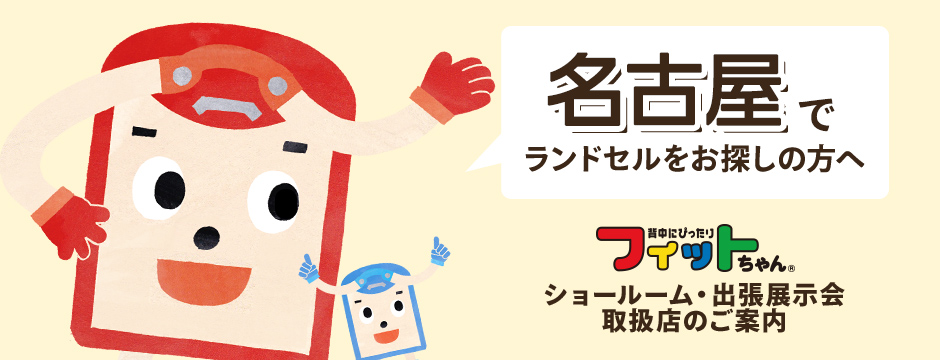 名古屋市の百貨店や専門店、ショッピングセンターなどにフィットちゃんランドセルを取扱って頂いております。お近くの取扱店で、フィットちゃんランドセルの背負いやすさを是非体感してみてください。