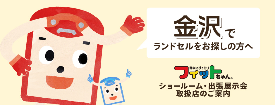 金沢市の百貨店や専門店、ショッピングセンターなどにフィットちゃんランドセルを取扱って頂いております。お近くの取扱店で、フィットちゃんランドセルの背負いやすさを是非体感してみてください。